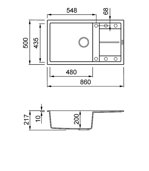 Integrovaná oblast pro příslušenství v odkapávači, vybavená předvrtanými otvory, které vám umožňují instalovat doplňky: excentrické ovládání odpadu, dřezovou baterii s vytahovací sprchou a dávkovač saponátu.